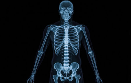 Detailed X-ray image of human skeletal system displaying entire bone structure from head to pelvis, including spine, ribcage, arms, and legs, set against dark background