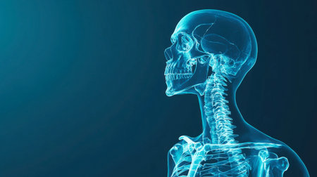 This image showcases an x-ray view of a human skeleton in profile, highlighting intricate bone structure and anatomy, ideal for educational and medical use.
