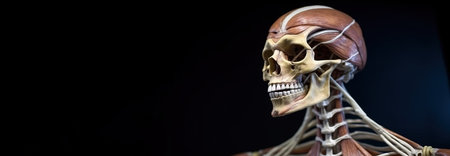 Anatomical structure of muscular system of human body, dark background. Header banner mockup with copy space. AI generated.