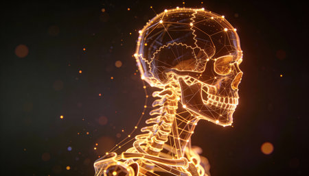 3d rendering of x-ray human skeleton with glowing particles on dark background