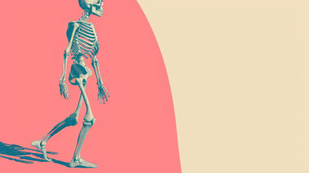 A stylized illustration of the human skeleton, highlighting major bones in a vibrant color scheme, placed against a contrasting background for visual impact