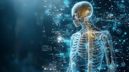 Futuristic anatomy visualization with illuminated human skeleton and organs. That the image is generated using AI.