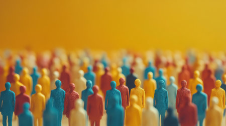 A multitude of miniature figures in various colors gathers symbolizing unity and diversity set against a vibrant orange background.