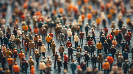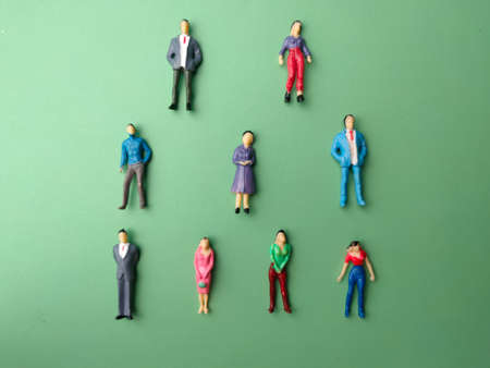 Colorful diverse miniature people figurines make crowd on ground