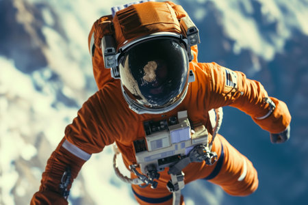 A photograph of a man wearing an orange space suit as he floats in the air, Portray an astronaut wearing a traditional orange NASA spacesuit in zero gravity, AI Generated