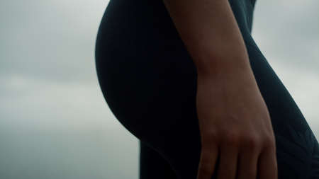 Fit woman body wearing black jeggings on cloudy beach close up. View of unknown girl sporty hips butt in relaxing pose training outdoors. Slim sportswoman standing seacoast. Workout fitness concept.