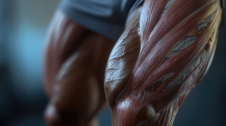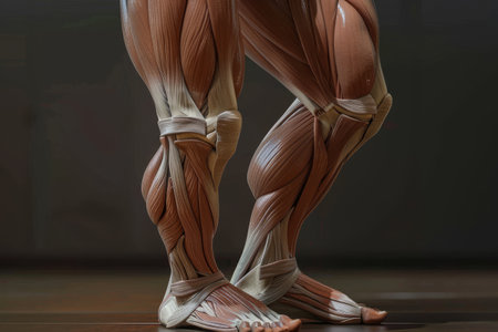 This image captures a striking close-up view of a muscular human leg, showcasing intricate muscle fibers and anatomical details, emphasizing strength and fitness.