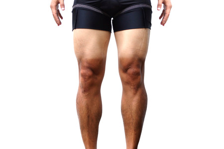Sunburn. Cyclist with massive sunburn on his legs isolated on white