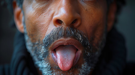 A close-up image of a man sticking out his tongue, conveying a sense of humor, playfulness, and mischief. The detailed facial features add texture and depth.