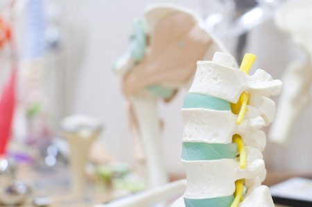 Human spine plastic model for surgery in clinic. Anatomical models of joints and nerves. Part of artificial lumbar spine model in neurology office. Medical, health, body care concept, space for text