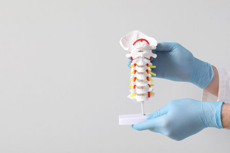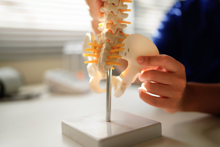 An orthopedic surgeon holds a spinal model as he demonstrates treatment methods for human spinal injuries caused by back pain during a medical consultation..