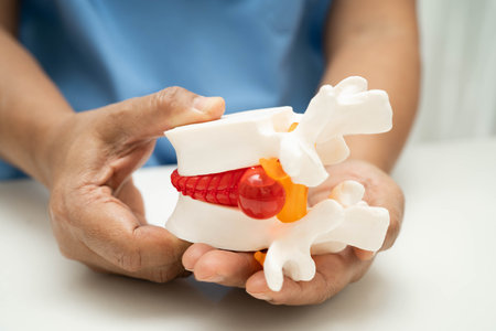 Doctor with lumbar vertebra bone skeleton and nerve model for treatment in the orthopedic department.