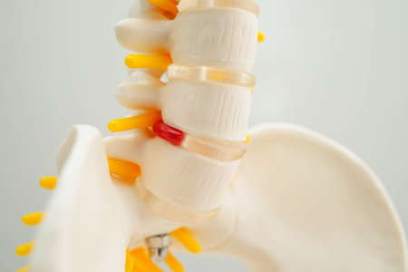A close up of an intervertebral hernia on a spinal model in a medical environment, focusing on spinal anatomy and pathology