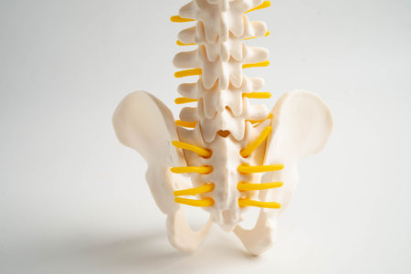 A detailed anatomical model showcases the human spine emphasizing the vertebraes structure and alignment. The model illuminated against a white background highlights the curvature and the distinct characteristics of each vertebra