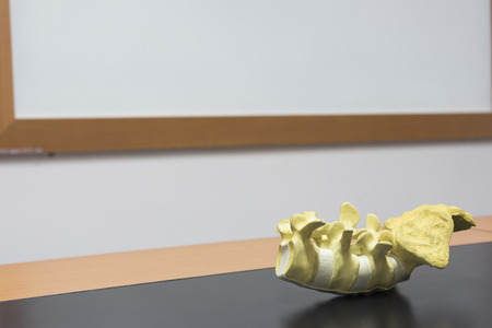 Close up human loins spine skeleton model. Medical clinic, education concept. Selective focus. Space for text.