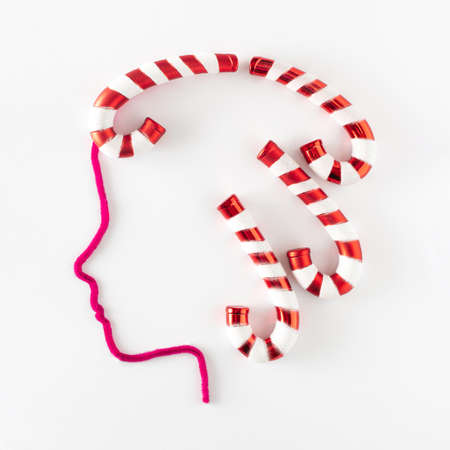 Minimal creative concept of New Year's hairstyle made of Christmas decorations from red and white sticks