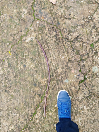 Giant Earthworm in Moist Garden Soil, Close-Up Macro Shot of Reddish-Brown Earthworm Compared to Shoe, Organic Gardening Concept