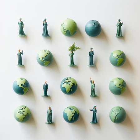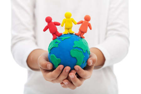 This image shows a miniature globe surrounded by a gathering of tiny people. The globe is brightly colored, depicting the continents and oceans of the world. The miniature people stand in a circle around the globe, creating a visual metaphor for global unity and connection.