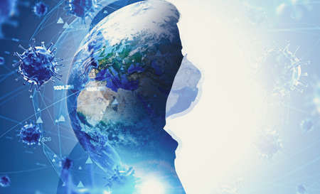 Side view of unrecognizable businessman in protective mask standing with double exposure of planet and covid 19 coronavirus. Toned image.