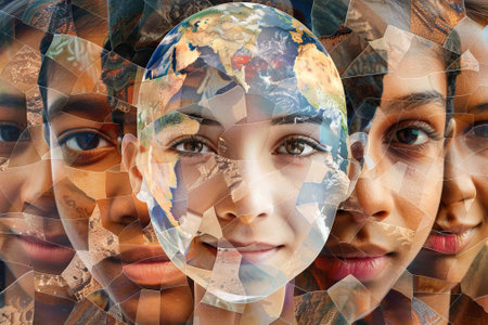 A collage of faces with a globe in the middle. The collage conveys the idea of unity and diversity among people