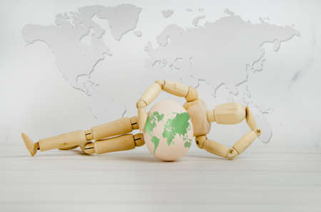 wooden man lies thinking about ecology. holding an egg in the form of planet Earth on the background of world map. concept environmental protection, travel, knowledge of the world. Earth day, study of geography