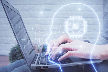 Double exposure of creative artificial Intelligence symbol with modern laptop on background. Neural networks and machine learning concept