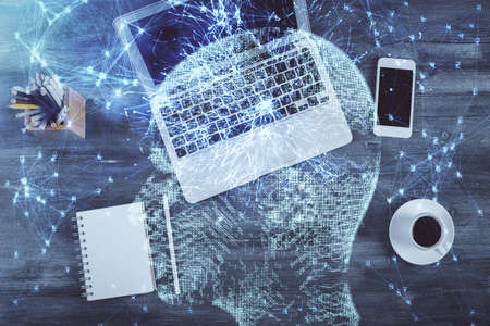 Multi exposure of brain sketch hologram over topview work table background with computer. Concept of big data.