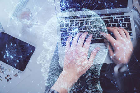 Double exposure of mans hands typing over computer keyboard and brain hologram drawing. Top view. Ai and data technology concept.