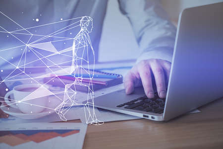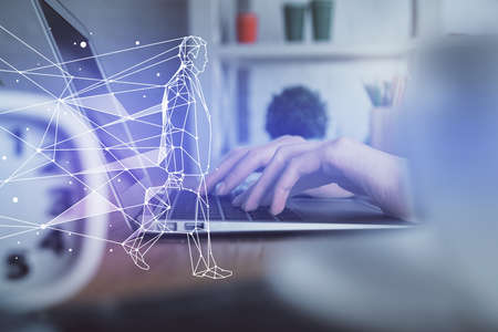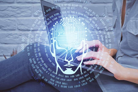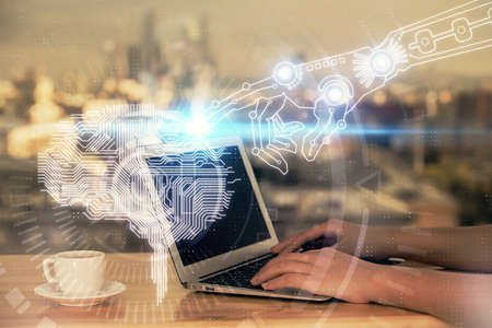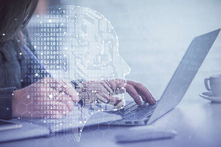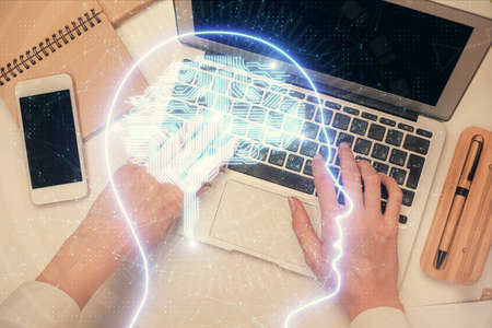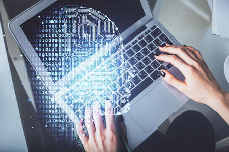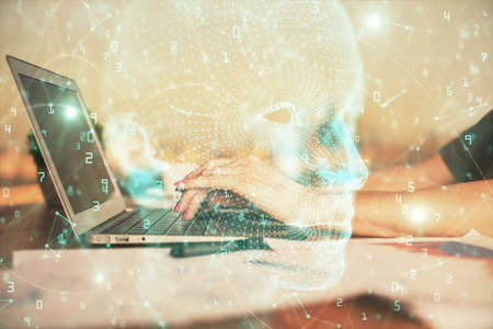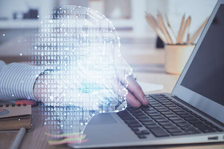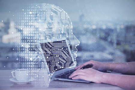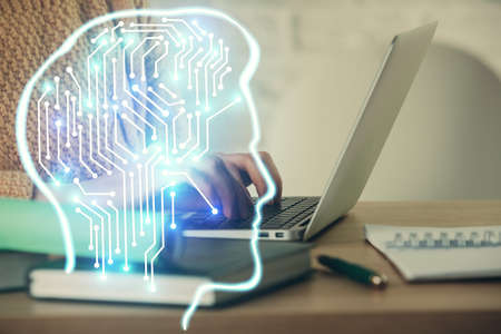Creative artificial Intelligence concept with human head hologram and hands typing on laptop on background. Multiexposure