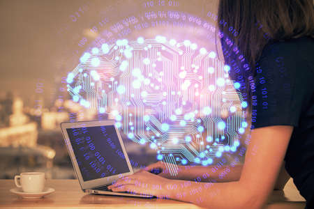 Double exposure of woman working on computer andhuman brain hologram drawing. Top View. Ai concept.