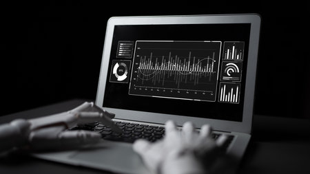 Technician and colleague use AI cognitive computing to extract information from complex data on laptop. Close up of teamworking IT experts using artificial intelligence on notebook