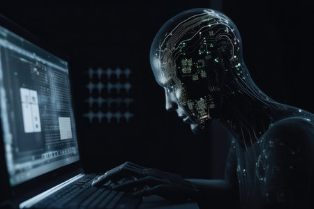 A close-up of a person interacting with a laptop displaying a futuristic robot