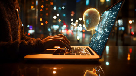 Person Interacting with Advanced AI Chatbot Technology on Laptop, Illuminated Cityscape at Night