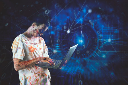 Picture of male zombie using a laptop while standing with wireless networking code binary background
