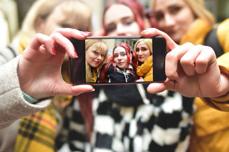 Three beautiful girlfriends in good spirits take a selfie in town. The concept of friendship