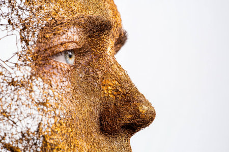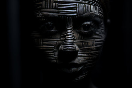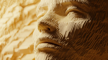 This captivating sculpture features a face formed from layered textures, showcasing intricate details and a blend of light and shadow. Perfect for artistic themes.