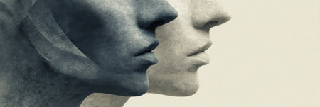 Two abstract faces are presented in profile, contrasting textures and colors, set against a neutral background. Their expressions suggest depth and emotion.