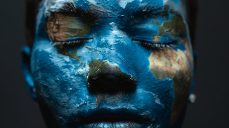 Portrait of a woman with a painted face and world map on her face