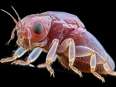 Flea on a pet's fur, highly magnified, showing detailed anatomy and fur texture