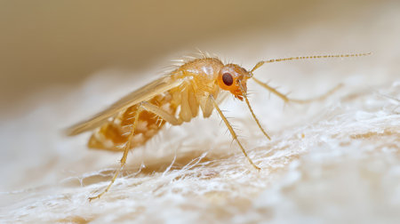 A tiny insect is resting on a light surface showcasing its delicate features and fine hair. The focus highlights its unique anatomy.