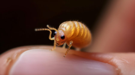 Macro shot of a termite crawling on a human finger.