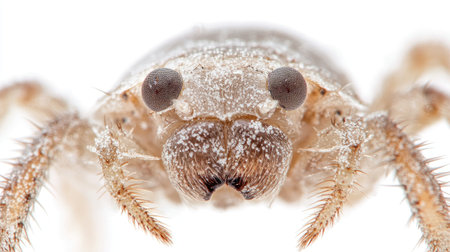 Extreme close-up of a dust mite, showcasing its tiny legs and textured body, isolated on a clean white background.