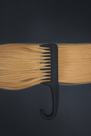Comb and piece of blond hair on black background. Hairdresser salon equipment concept, premium hairdressing set. Accessories for haircut with copy space.