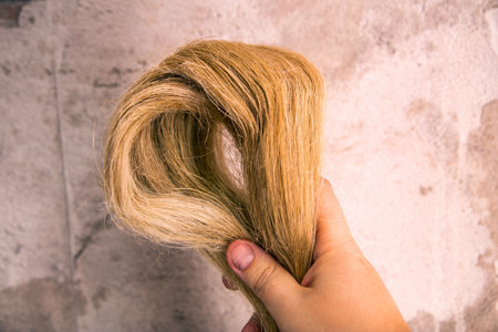 Cut length of brown hair tied and ready for donation to charity for people with cancer or hair loss to make wigs and head covering