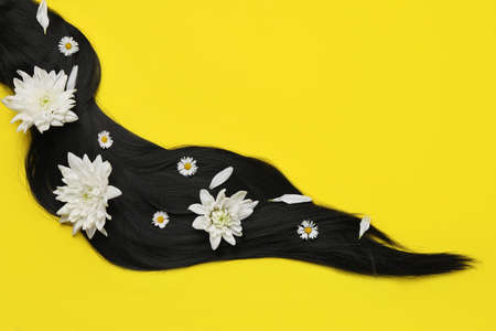 Lock of healthy black hair with flowers on yellow background, top view. Space for text
