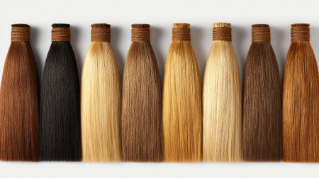 Eight hair color samples arranged in a row showcase a variety of shades from dark to light. Ideal for beauty professionals seeking inspiration for hairstyles and color trends.