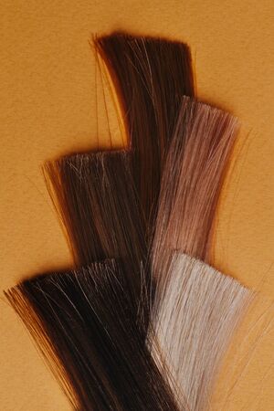 Locks of dyed hair. Samples of different color and shade lie in hairdressing salon on an orange surface. Arranged in a weaved pattern. top view. Close up.