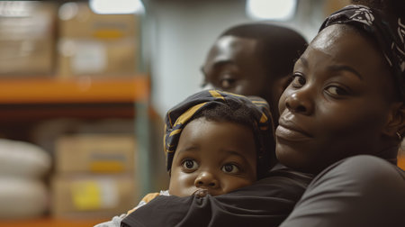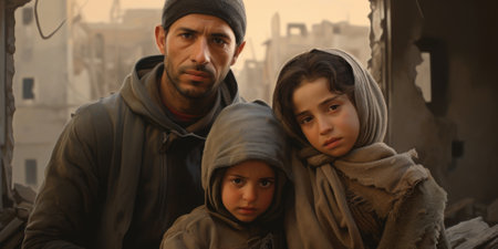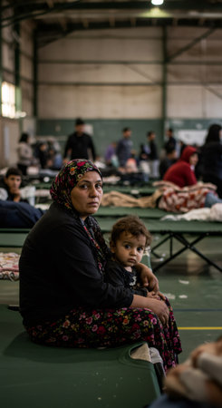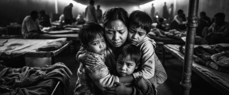 Refugee family is hugging in a crowded shelter, finding comfort and solace in each other's arms.