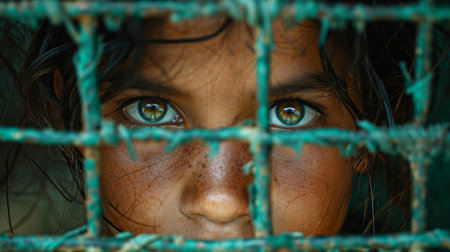 A child with haunting eyes covers his mouth in silence among a crowd, conveying a powerful message of fear and the need for protection
