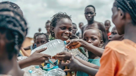 A vibrant scene capturing a woman smiling as she distributes water bottles to eager children, highlighting community solidarity and support in rural Africa.